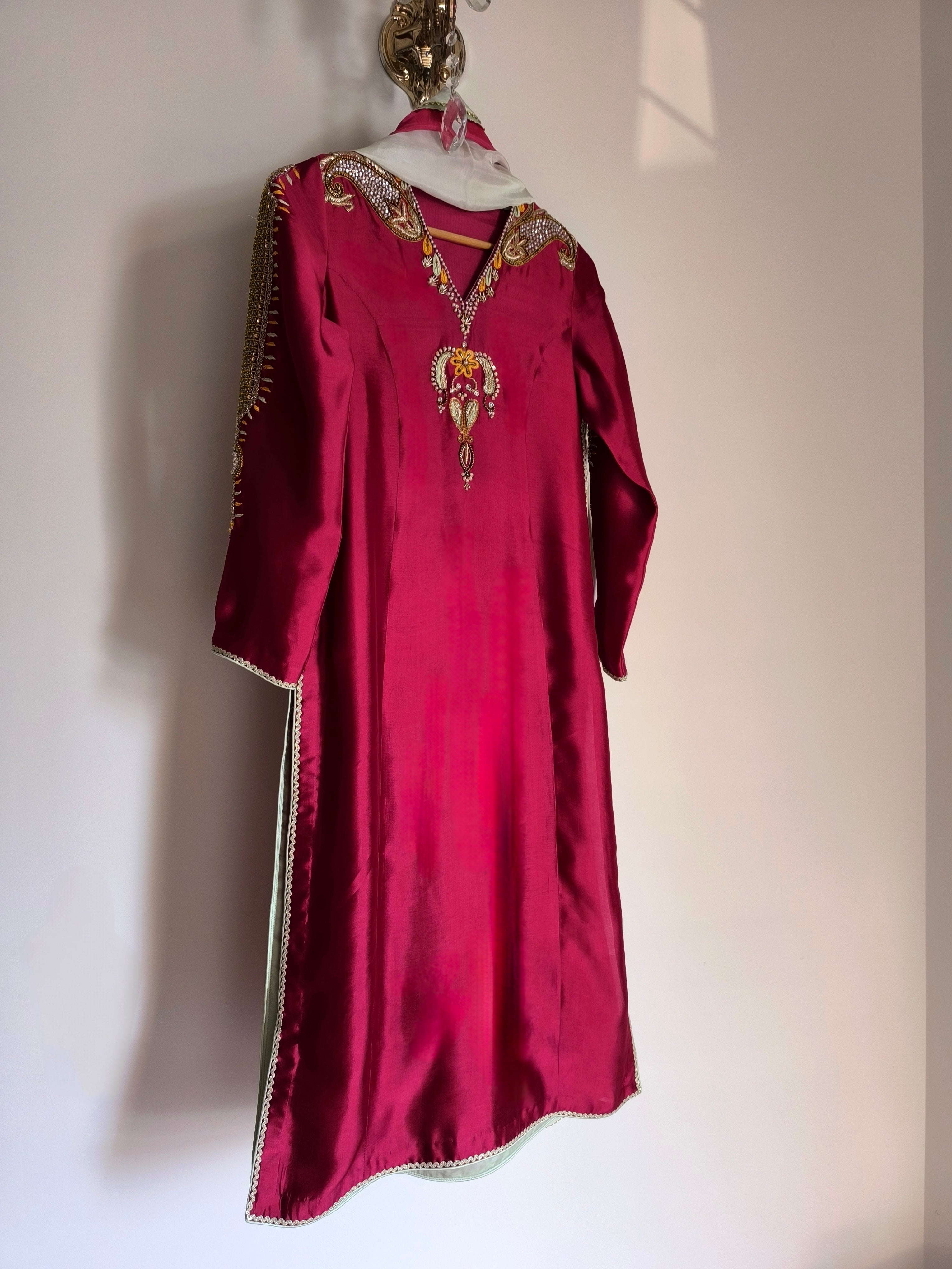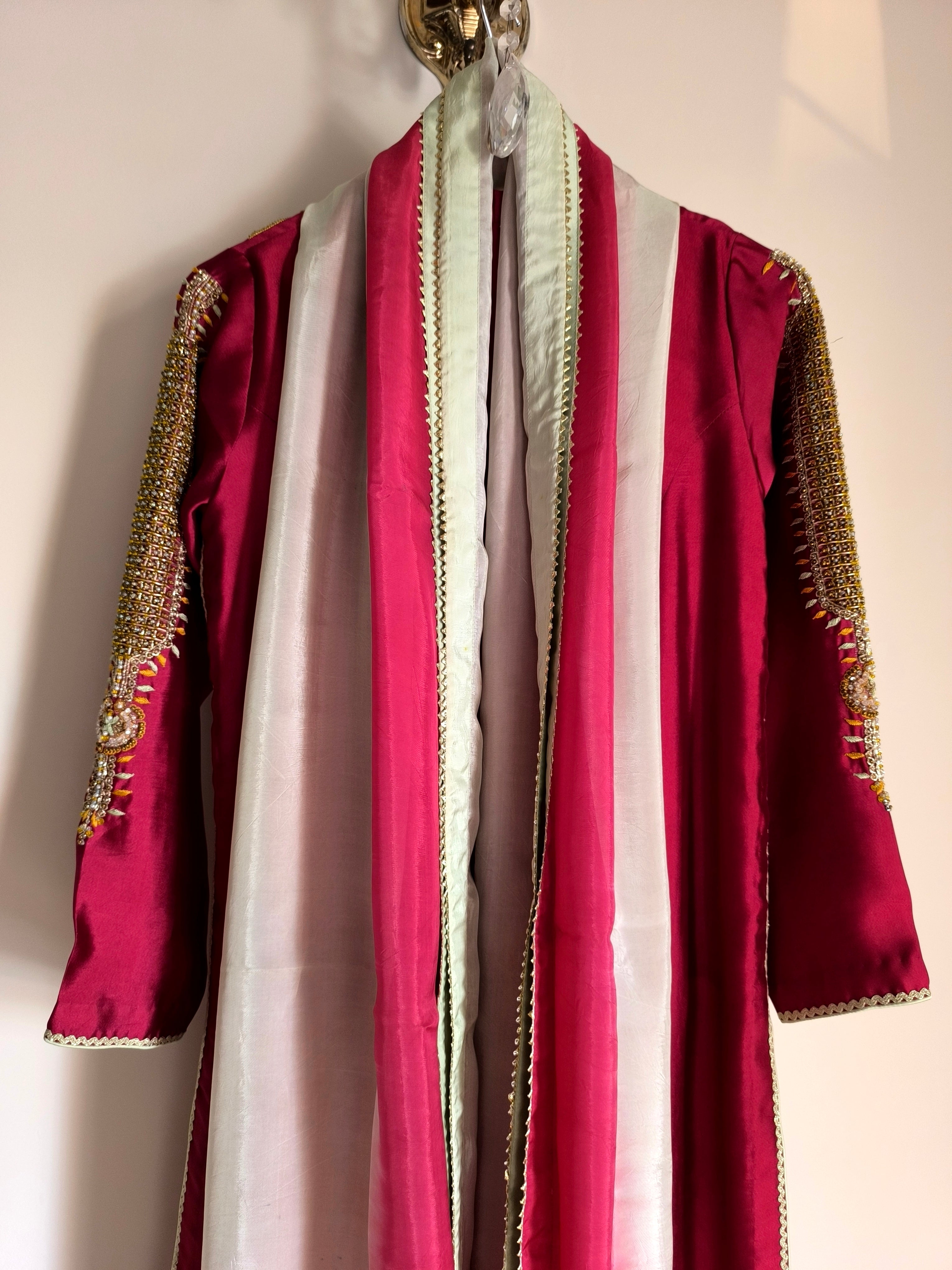 ‘Ambar’, is a beautiful Red number paired with culottes made in pure sheesha silk. It has an immaculate needlework that is hard to miss — both in its design and its making. Two toned silk dupatta can be added to complete the look.
