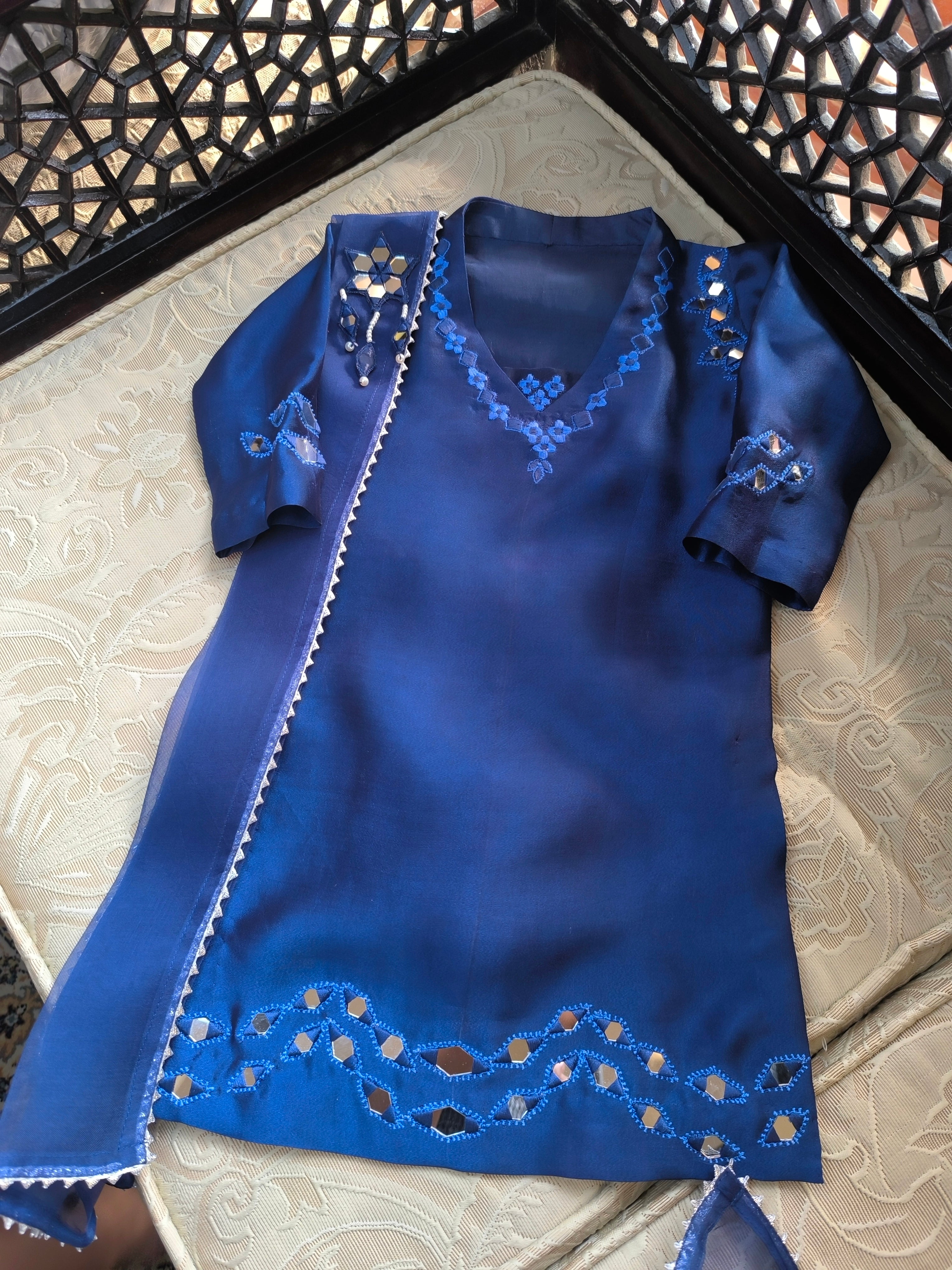 Crafted from pure sheesha silk, Noor is crafted in a captivating blue hue and embellished with mirror embroidery along the front daaman, armholes, and sleeves. The intricate detailing blends timeless tradition with a contemporary sensibility. Pair it with this statement organza dupatta, pleated and secured at the center with a mirror motif for a fashion-forward look.
