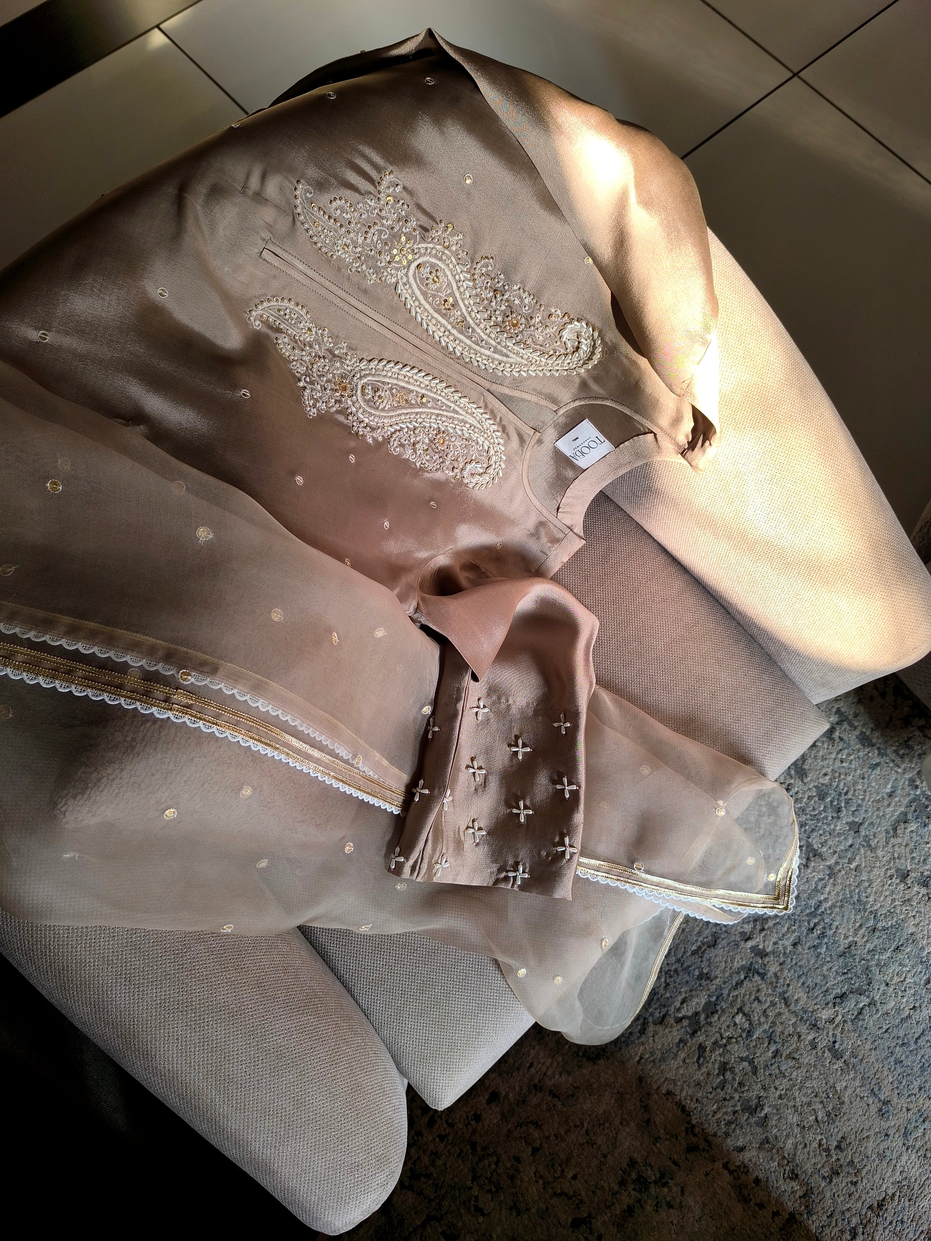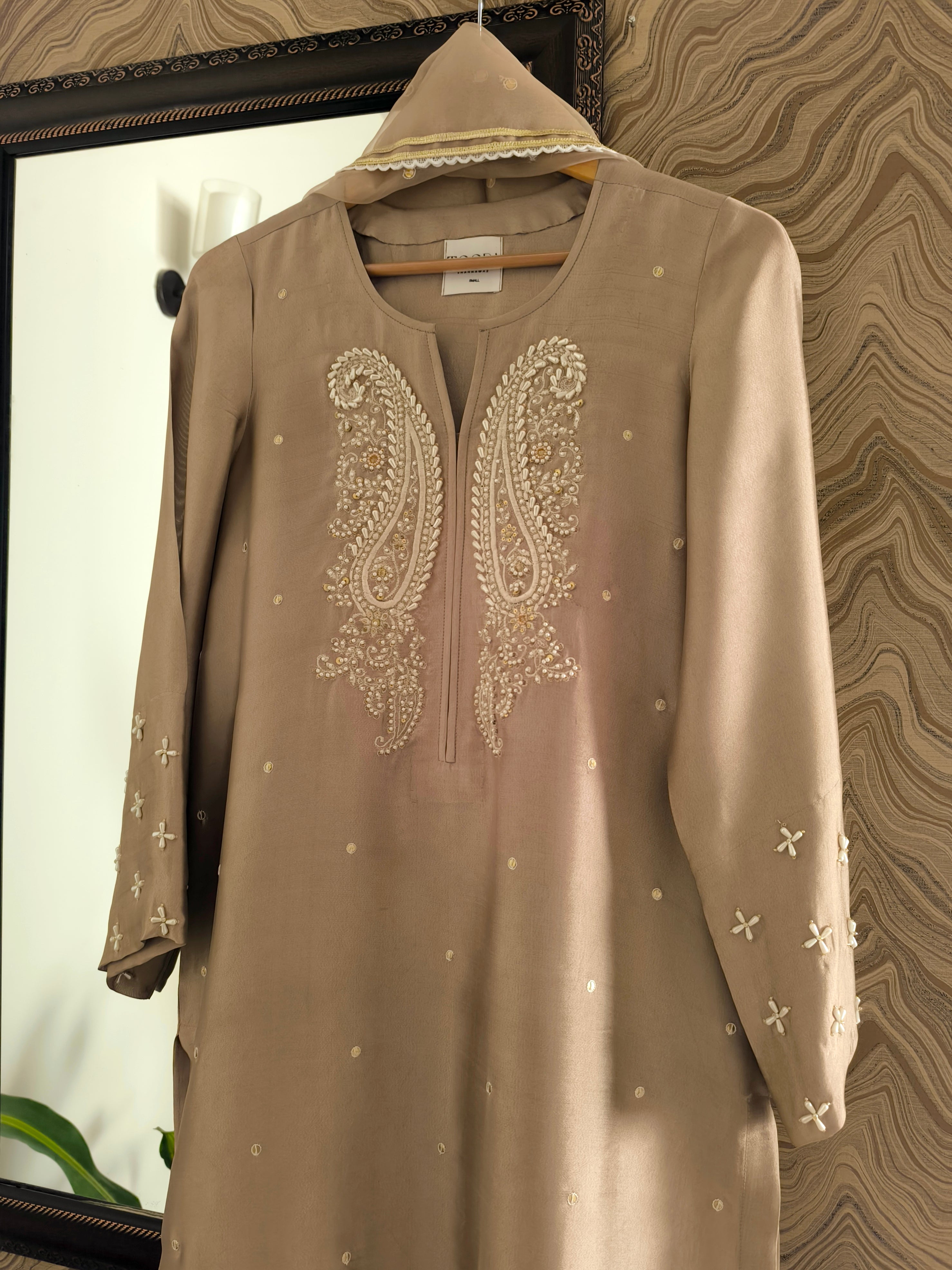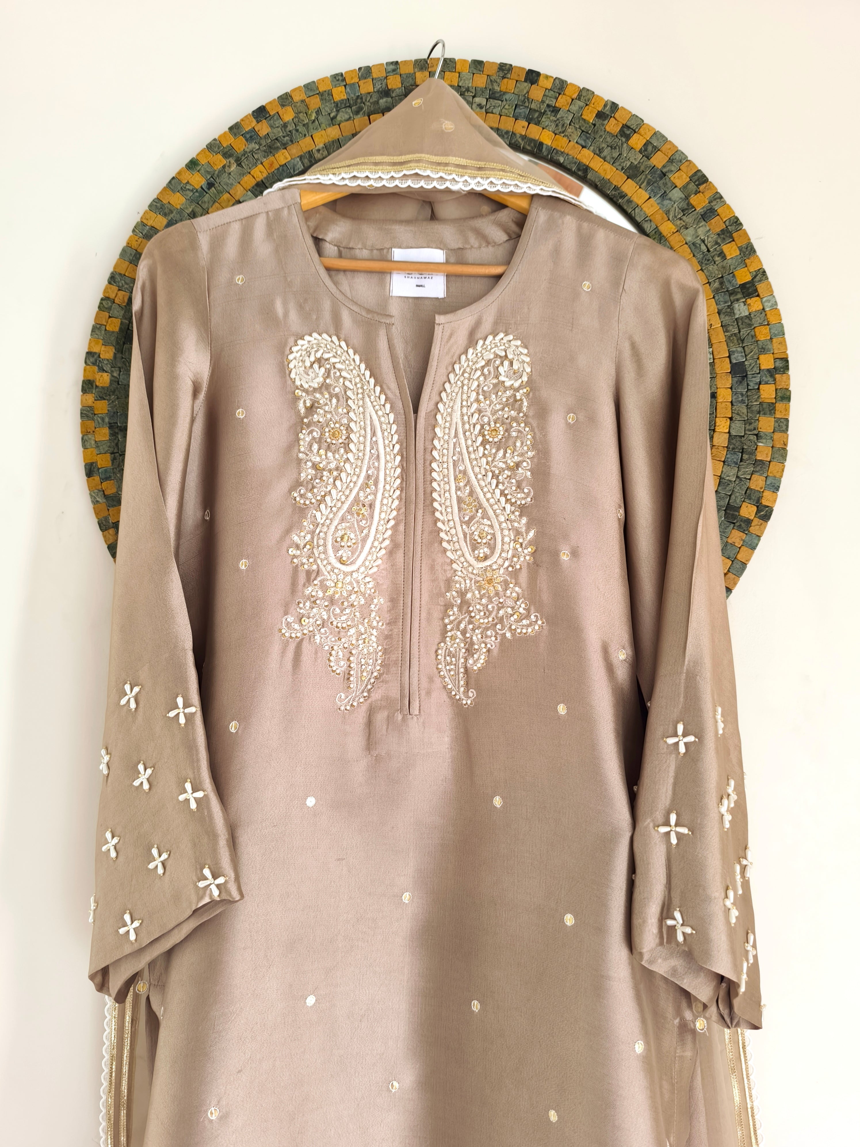 Mehru is a timeless classic and a must-have addition to your wardrobe. Crafted from luxurious sheesha silk, this long straight shirt features elegant paisley motifs, delicately embellished with pearls and sequins along the front and sleeves. Versatile in style, it can be paired with matching pants for a seamless look, or styled with white or contrasting shades of blue or green. Complete the ensemble with our organza dupatta for a truly classic look.