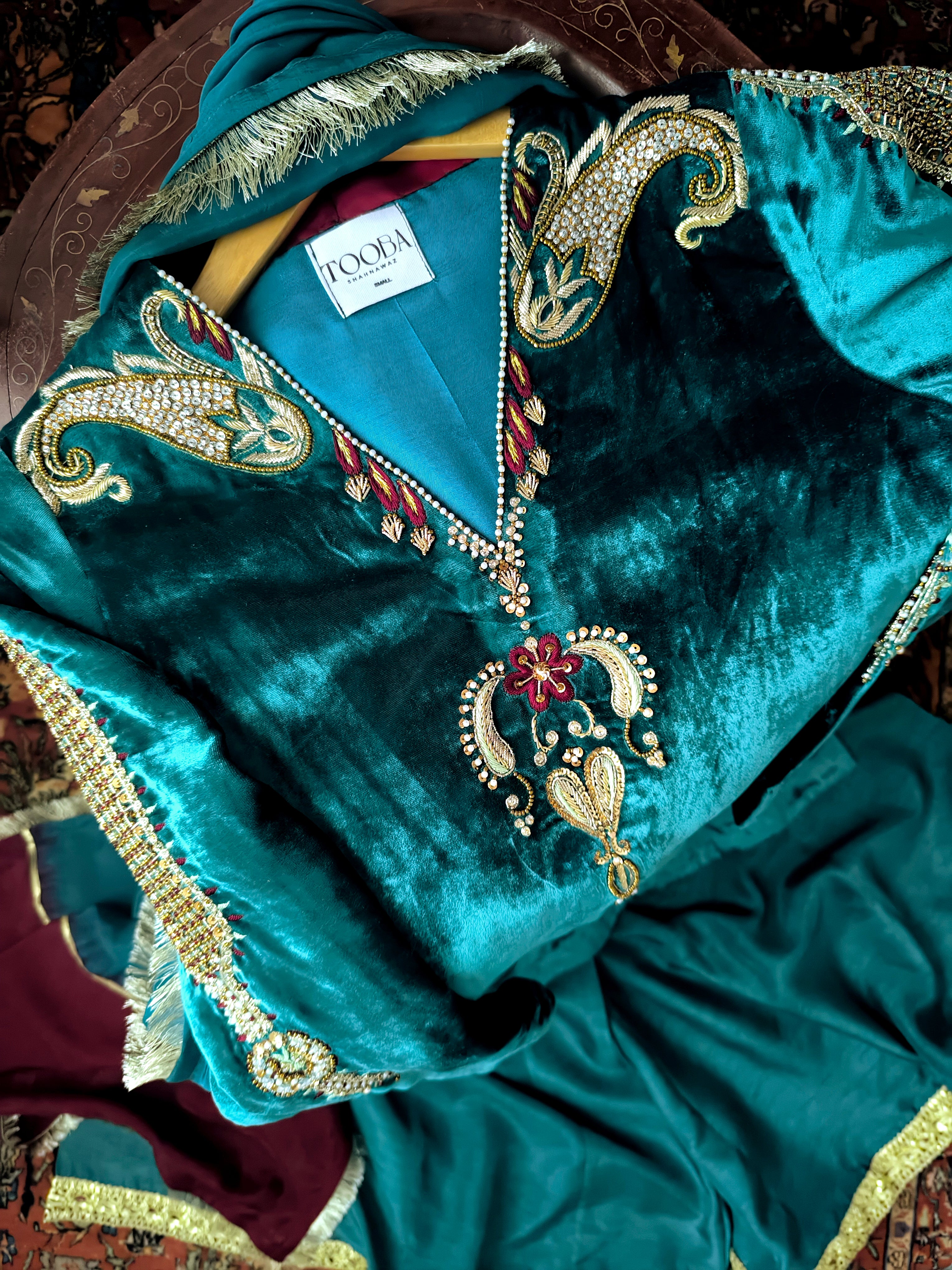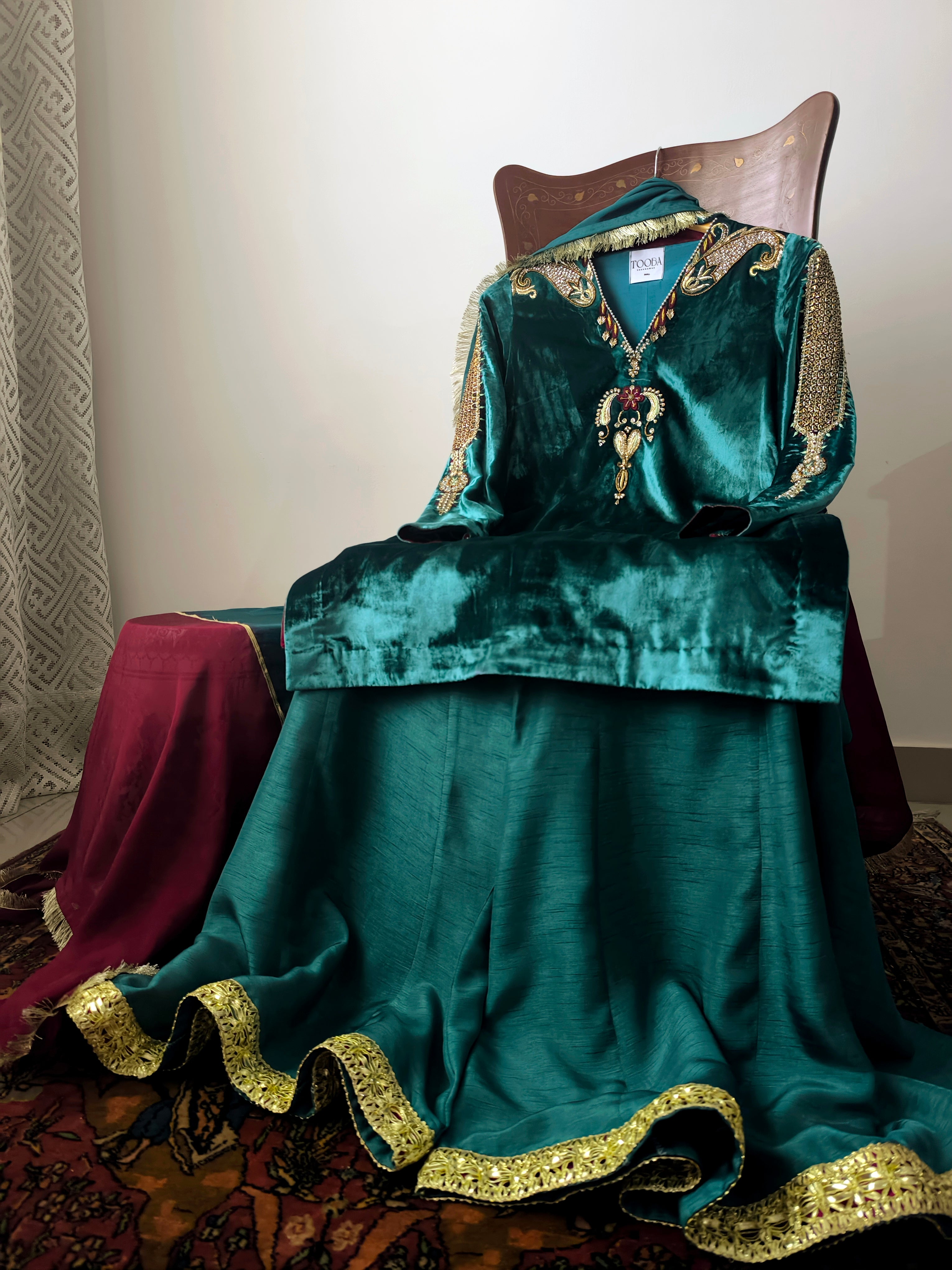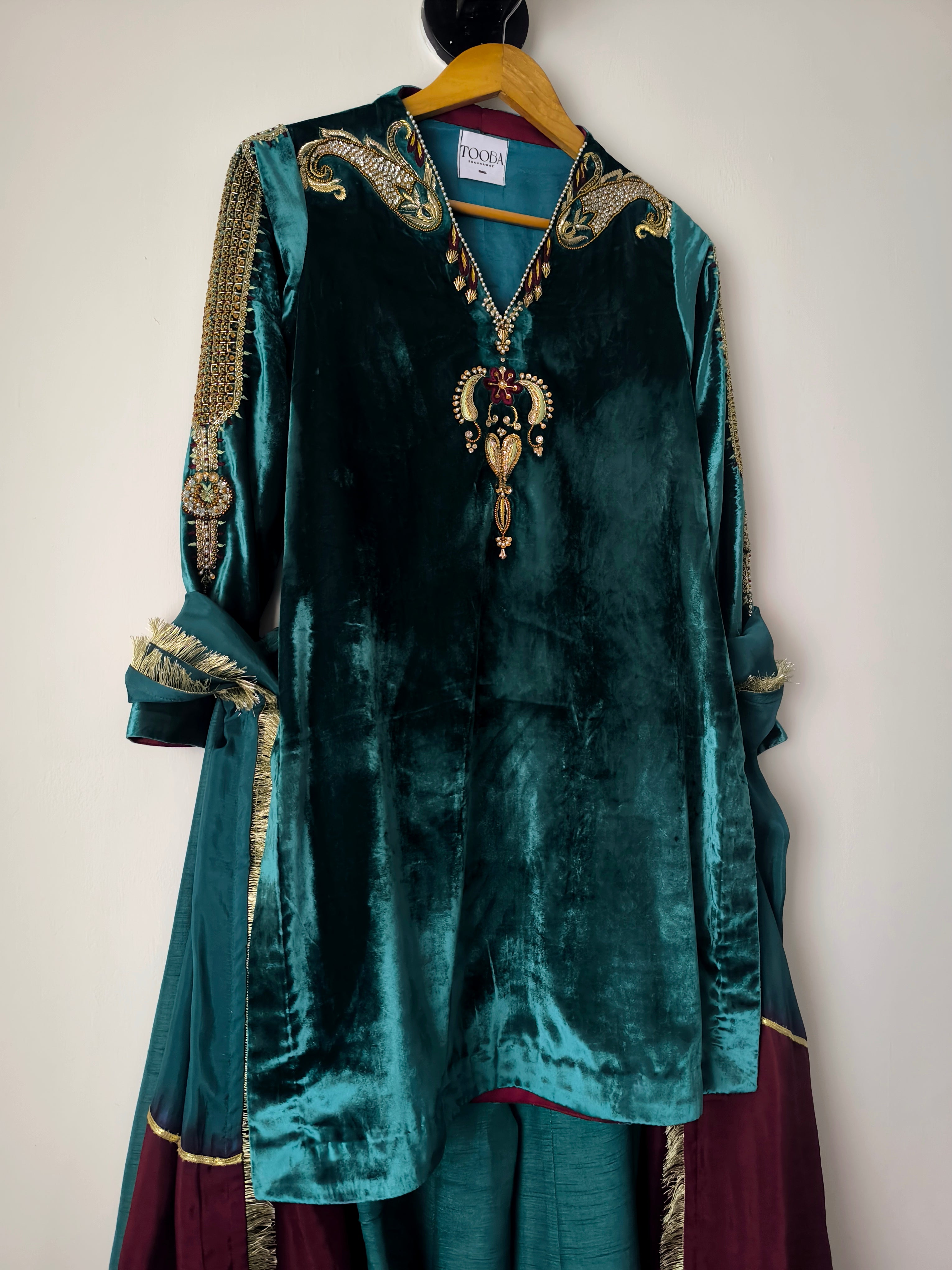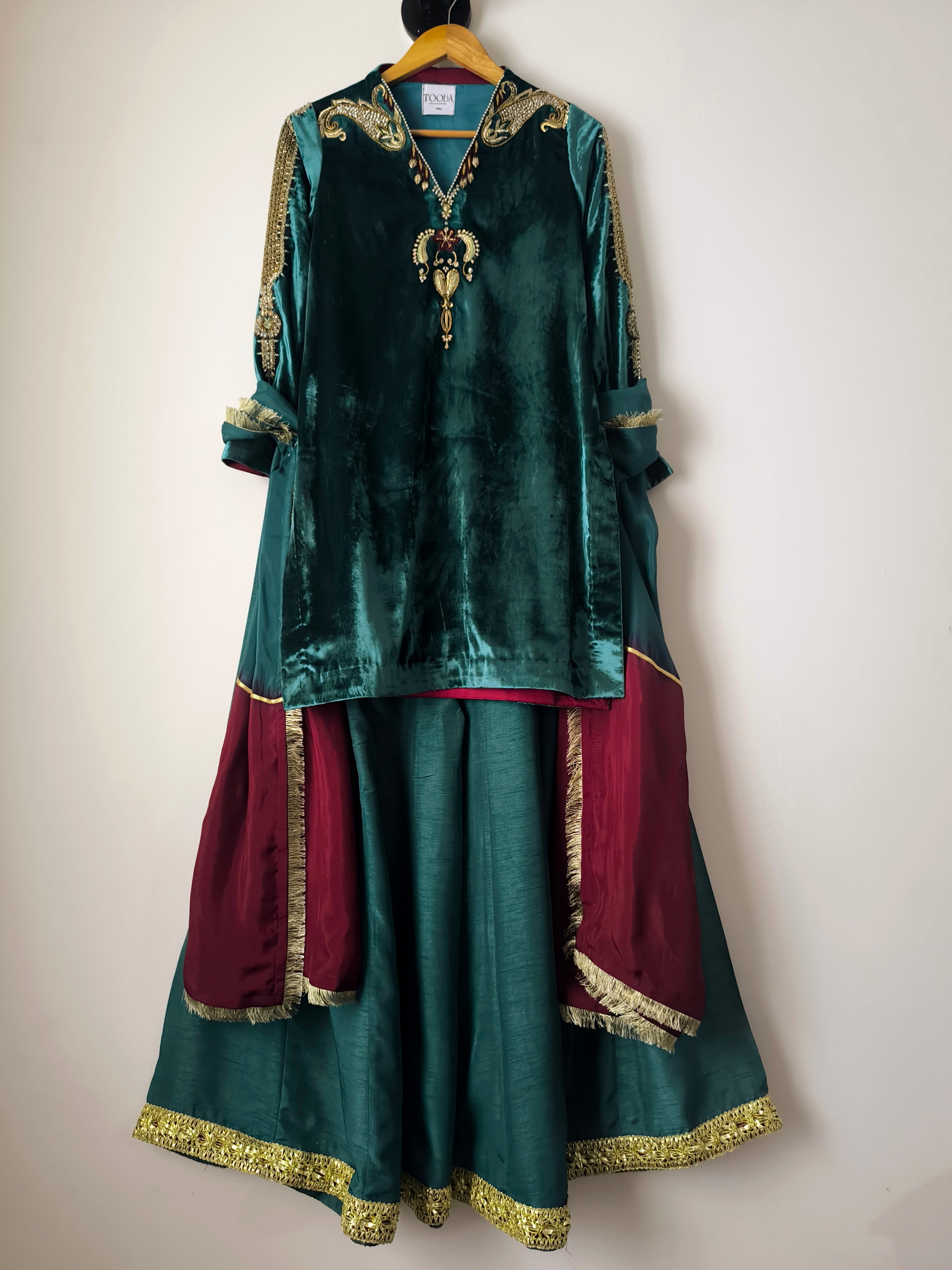 ‘Ambar’, is a beautiful teal number. Paired with a paneled sharara and a two-toned silk dupatta, the needlework is hard to miss — both in its design and its making. The gold edging ties everything together beautifully.