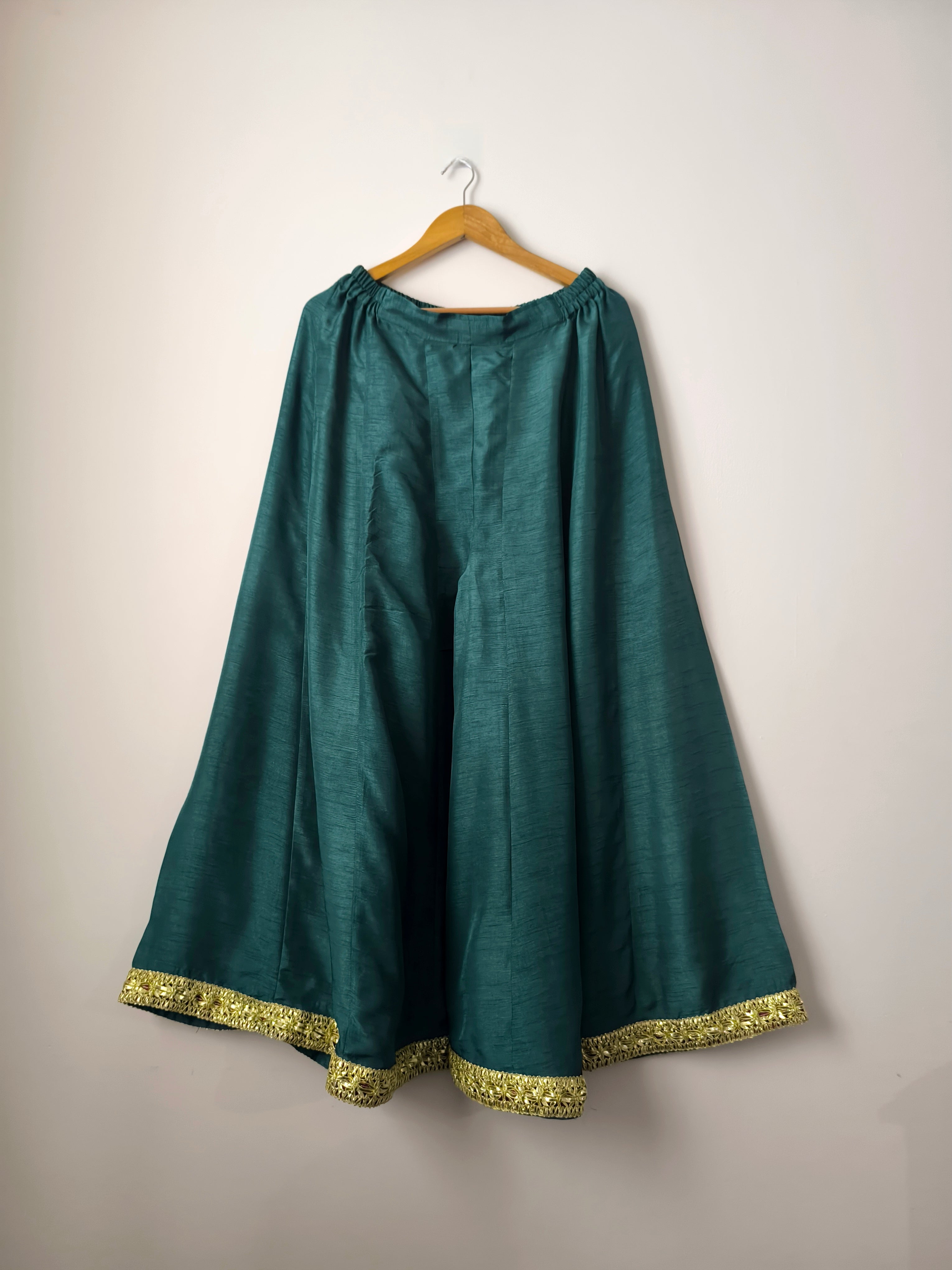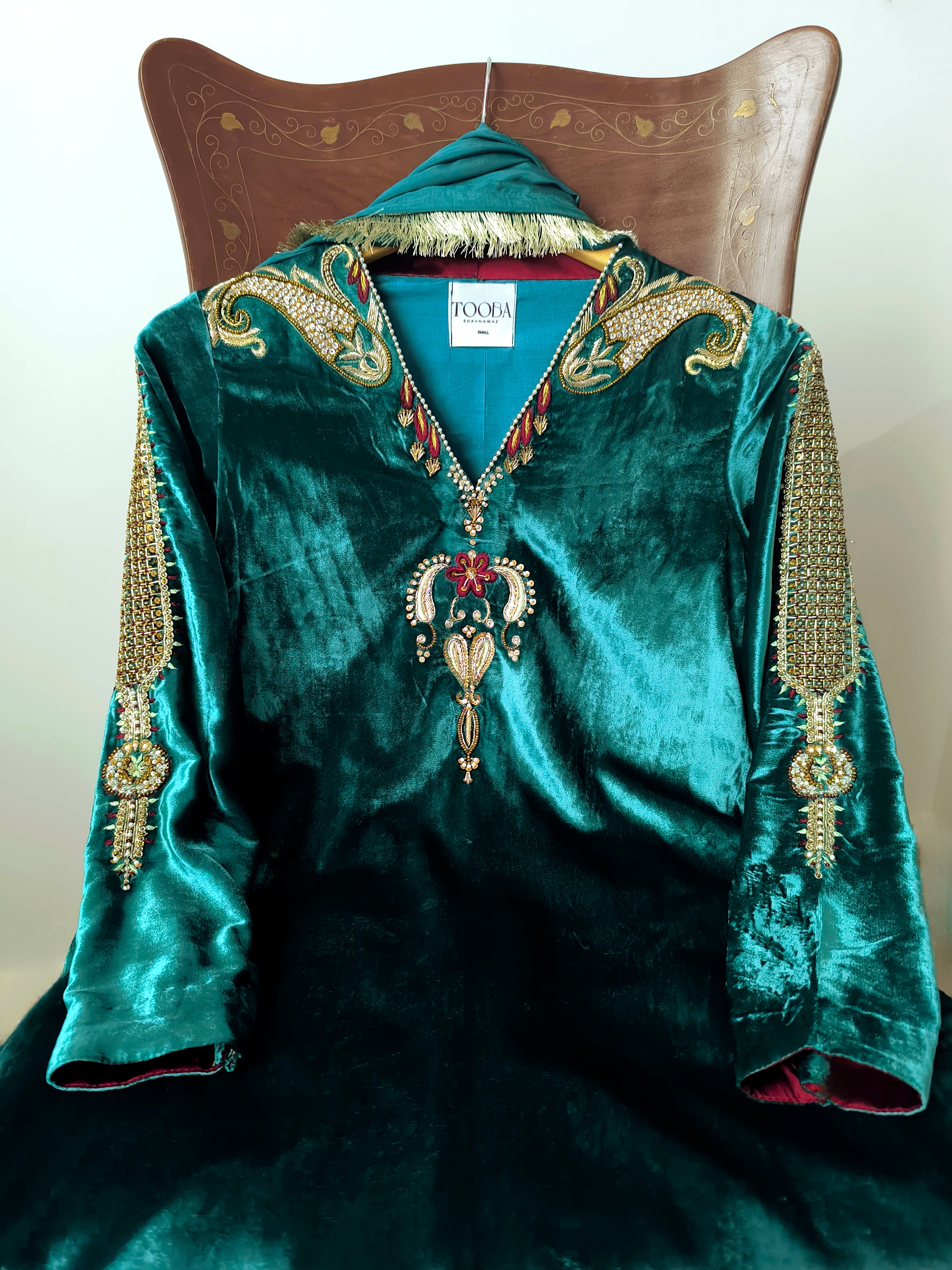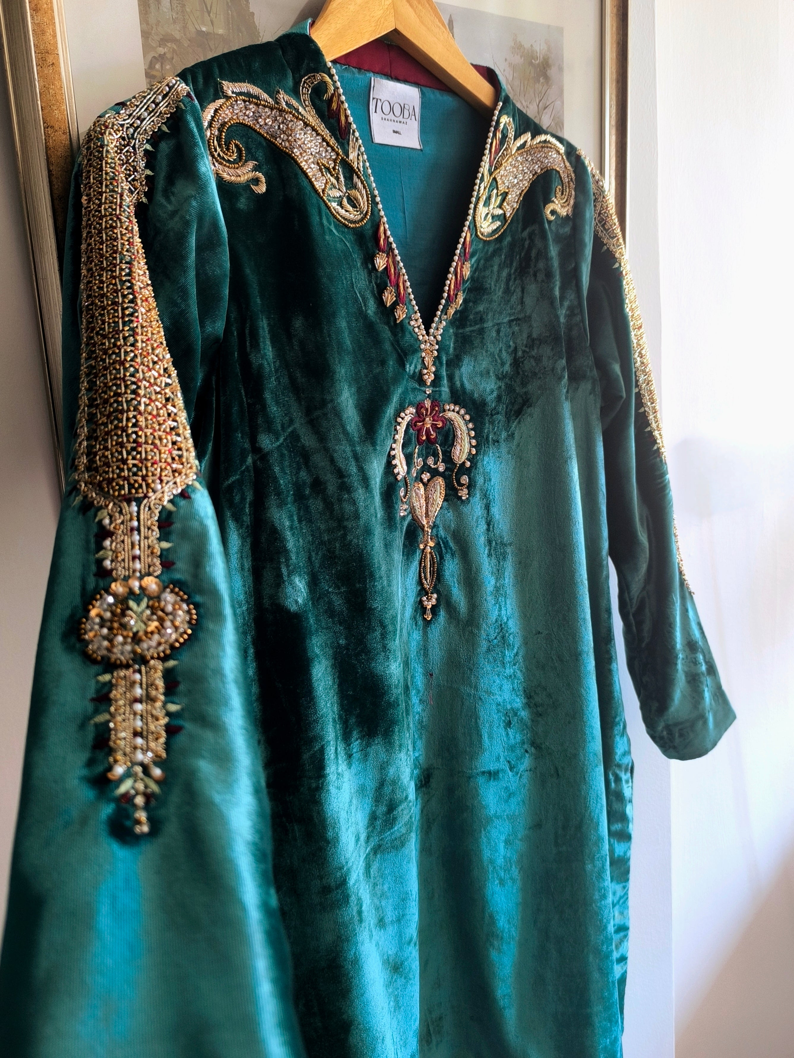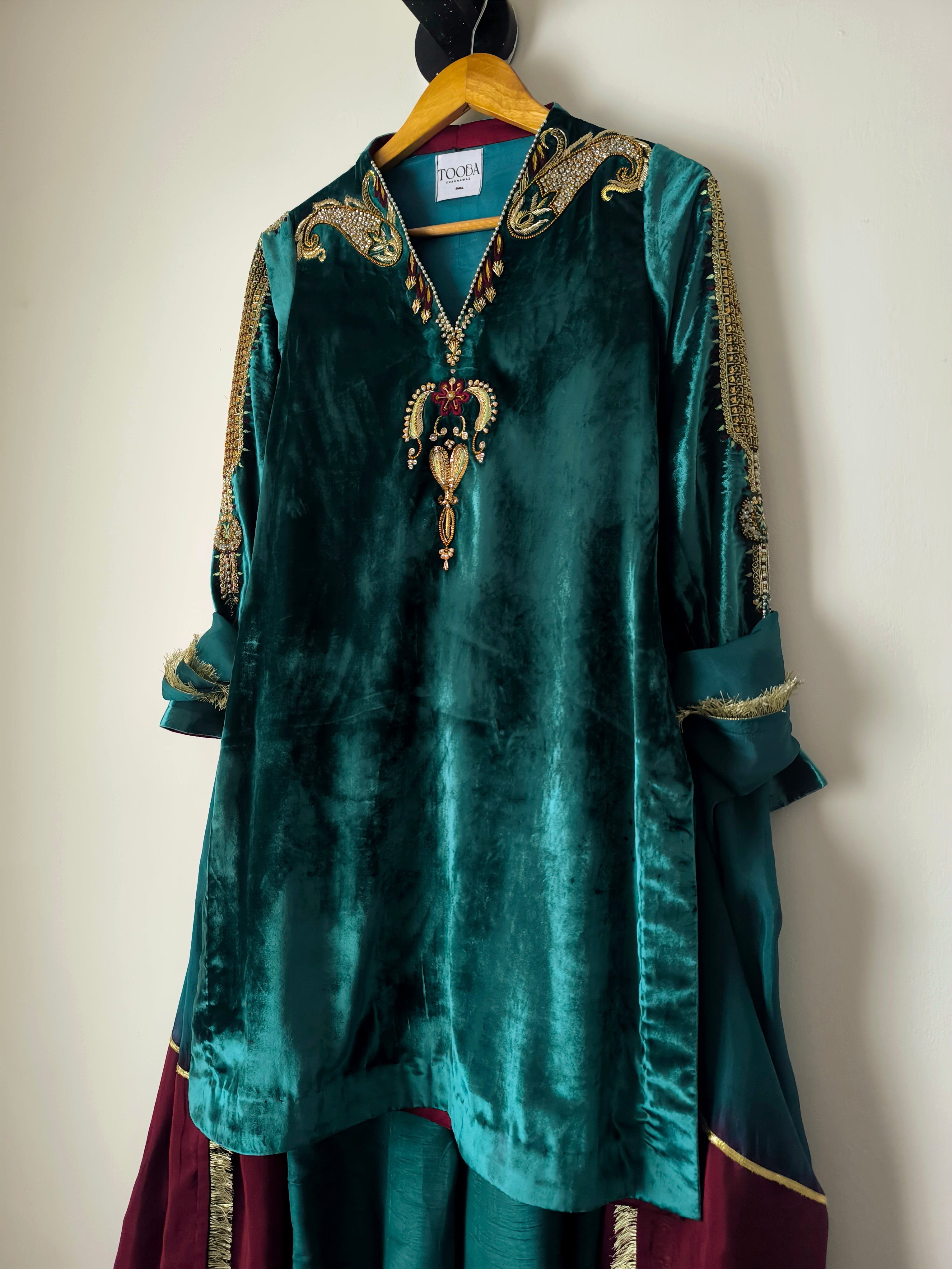 ‘Ambar’, is a beautiful teal number. Paired with a paneled sharara and a two-toned silk dupatta, the needlework is hard to miss — both in its design and its making. The gold edging ties everything together beautifully.