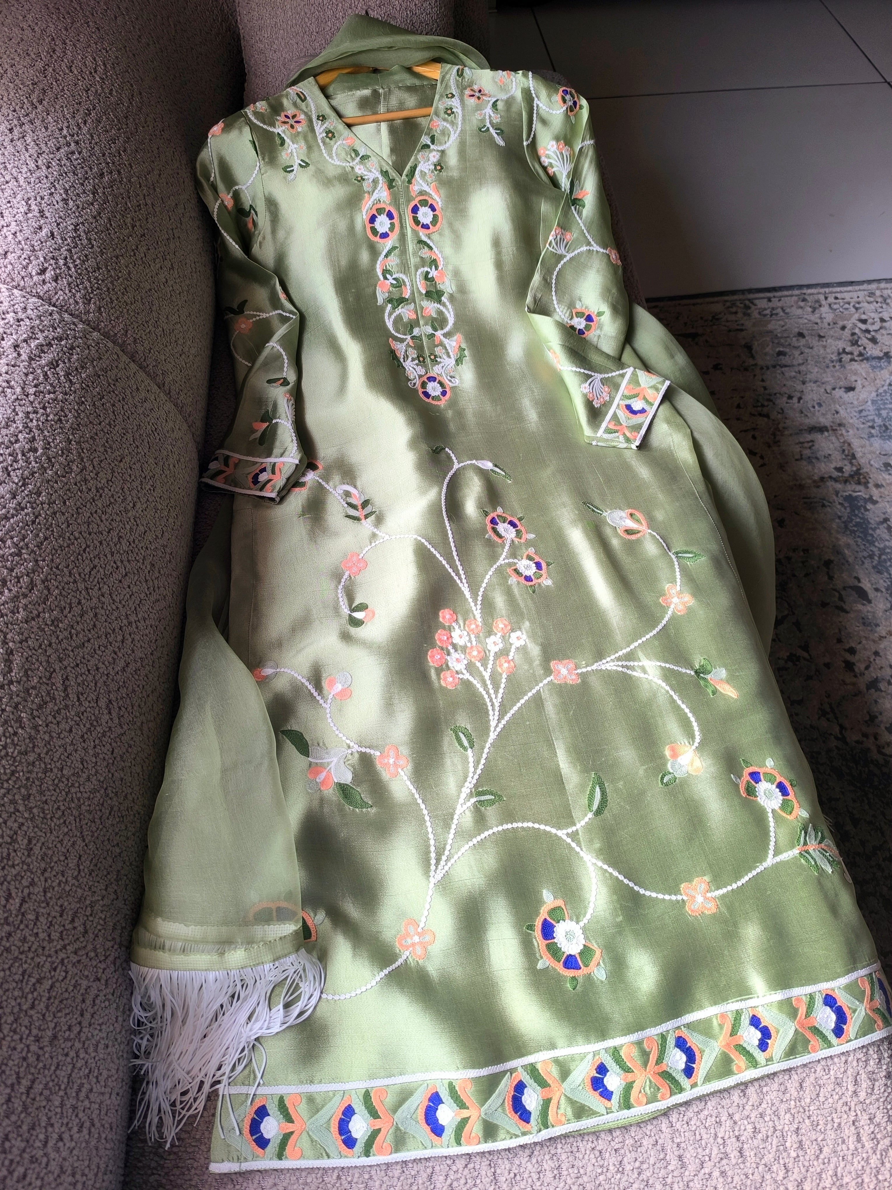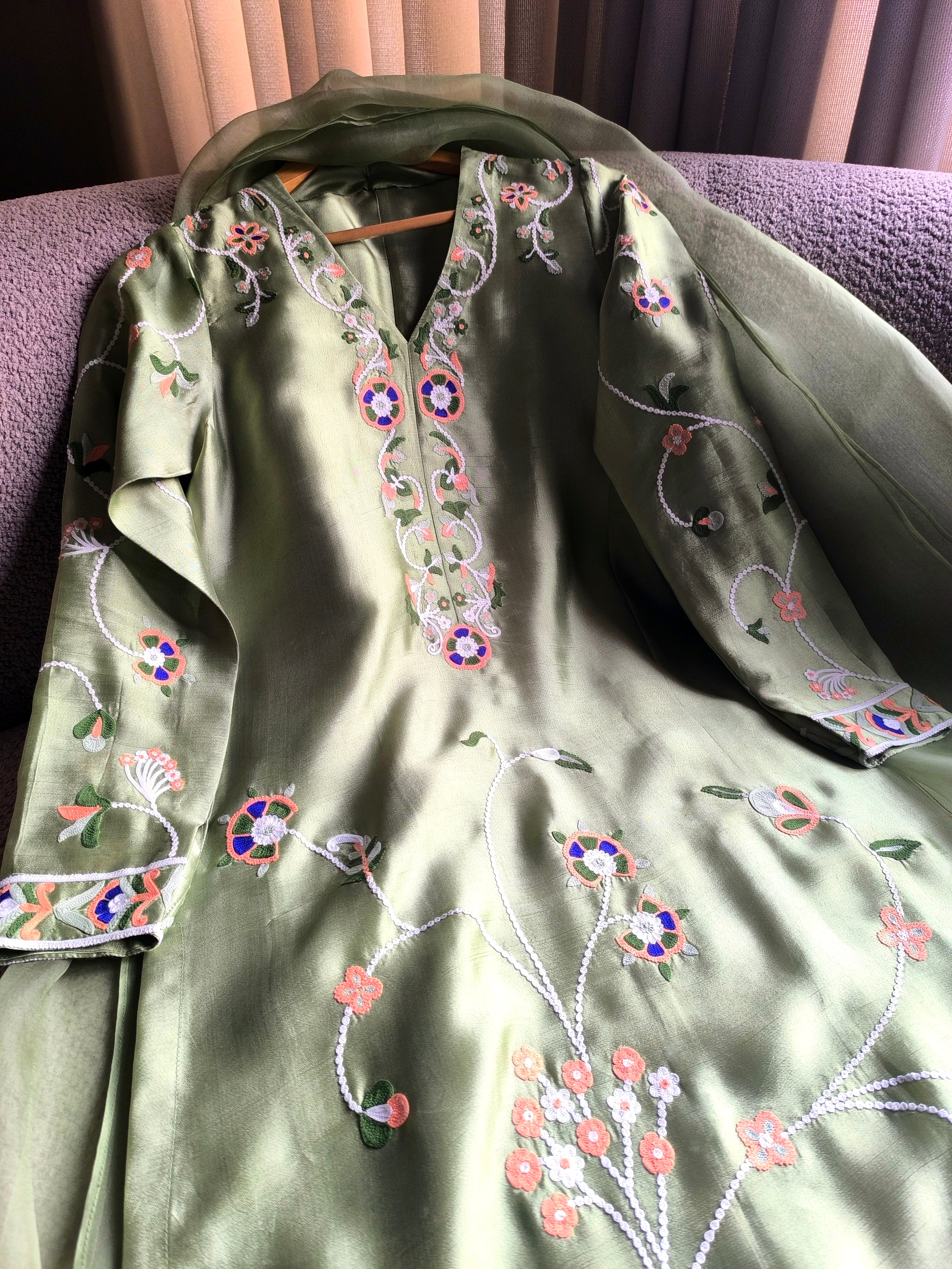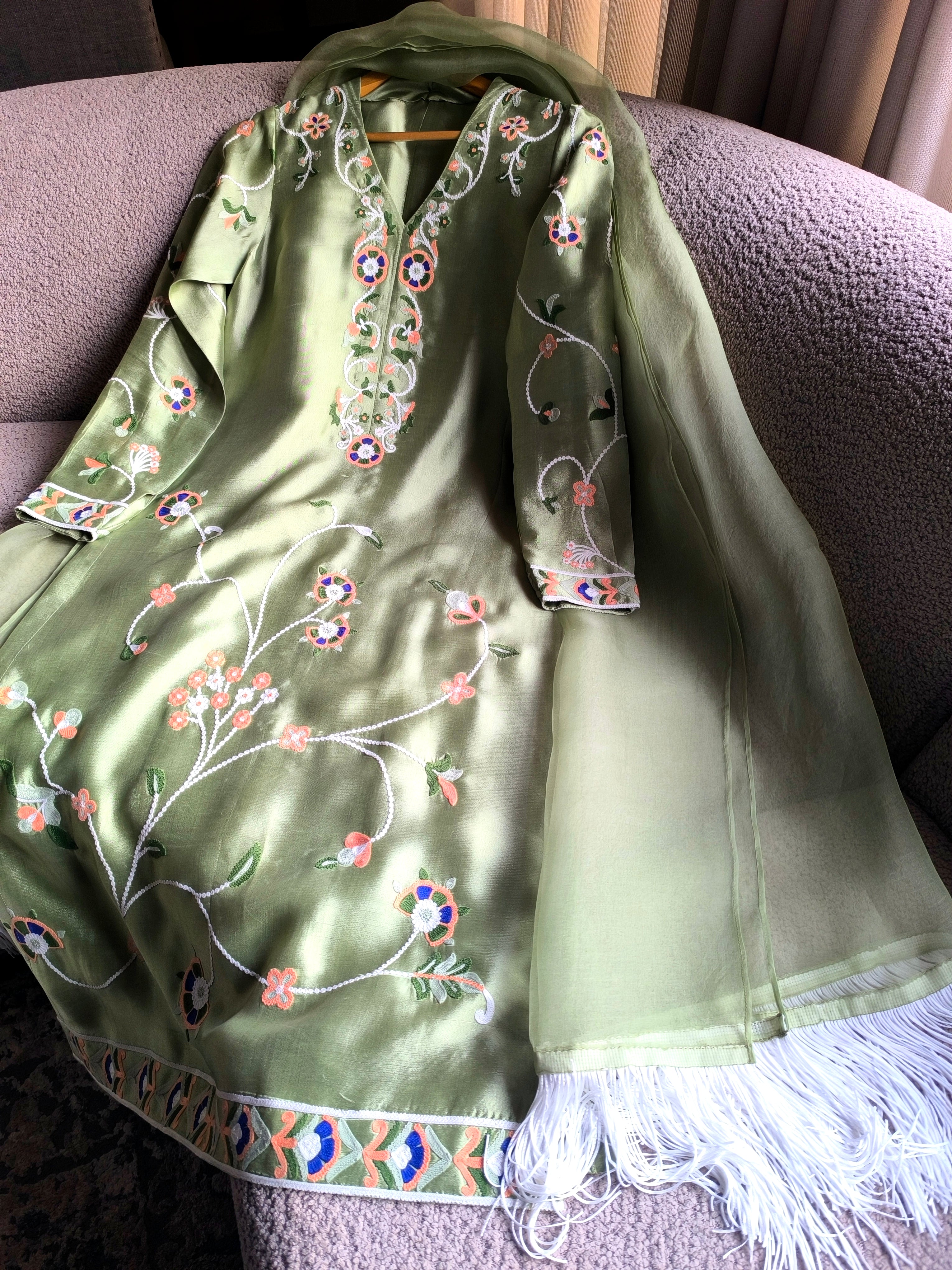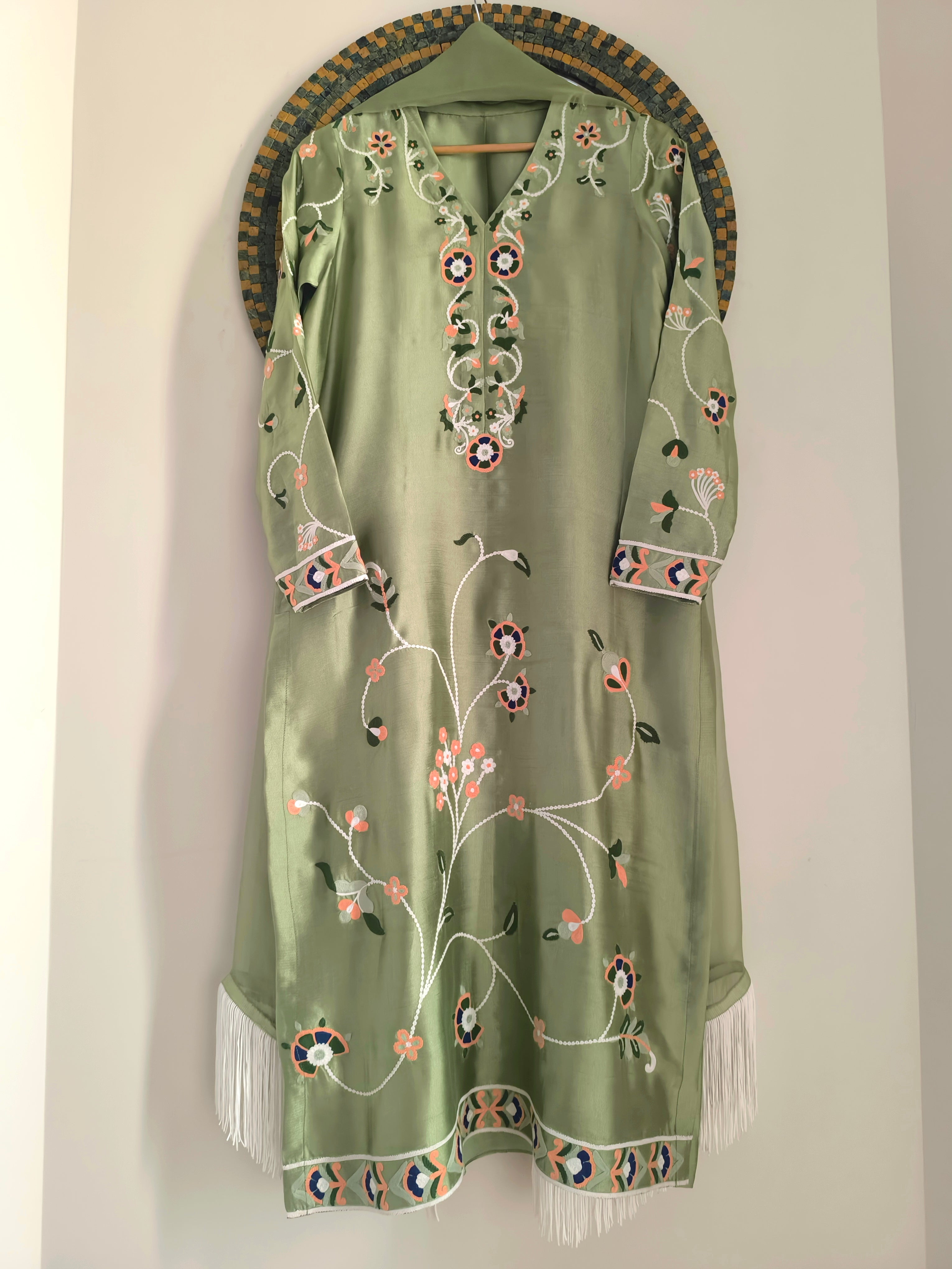 Myra is a statement two-piece set in a soft mint green hue, adorned with ari embroidery in peach, blue, white and shades of green. Complete the look with out organza dupatta featuring a fringe for a delightful touch of playfulness.