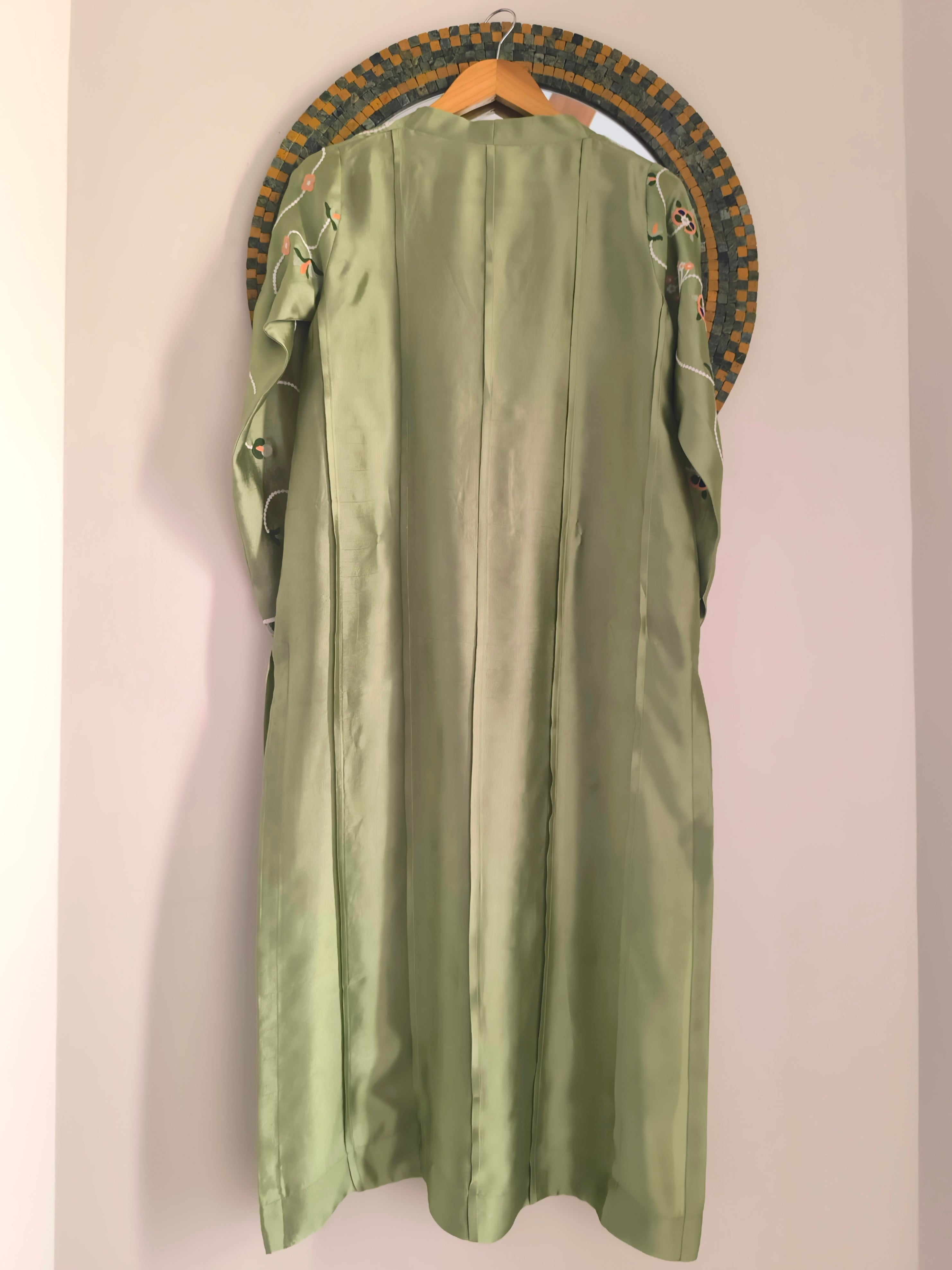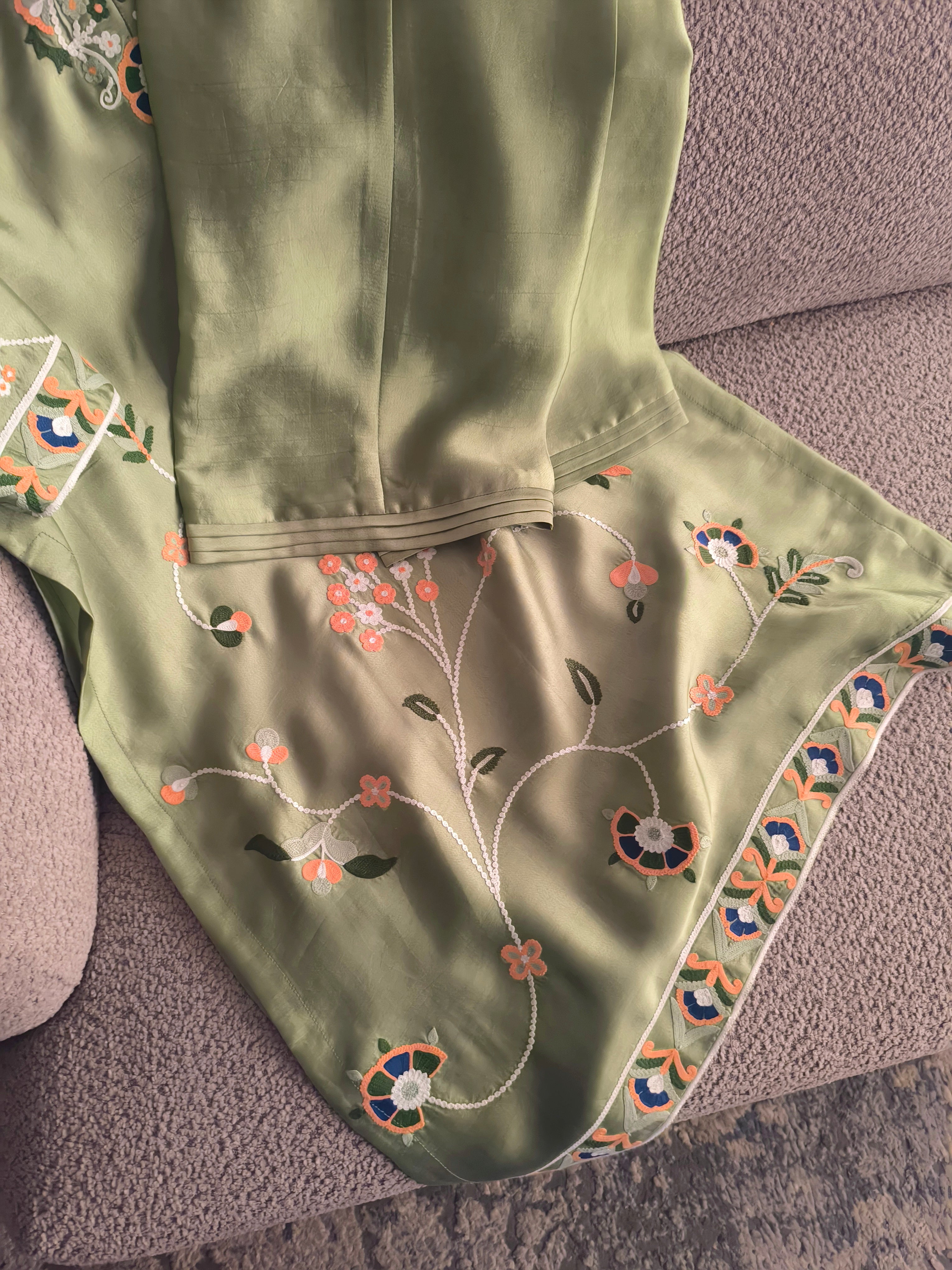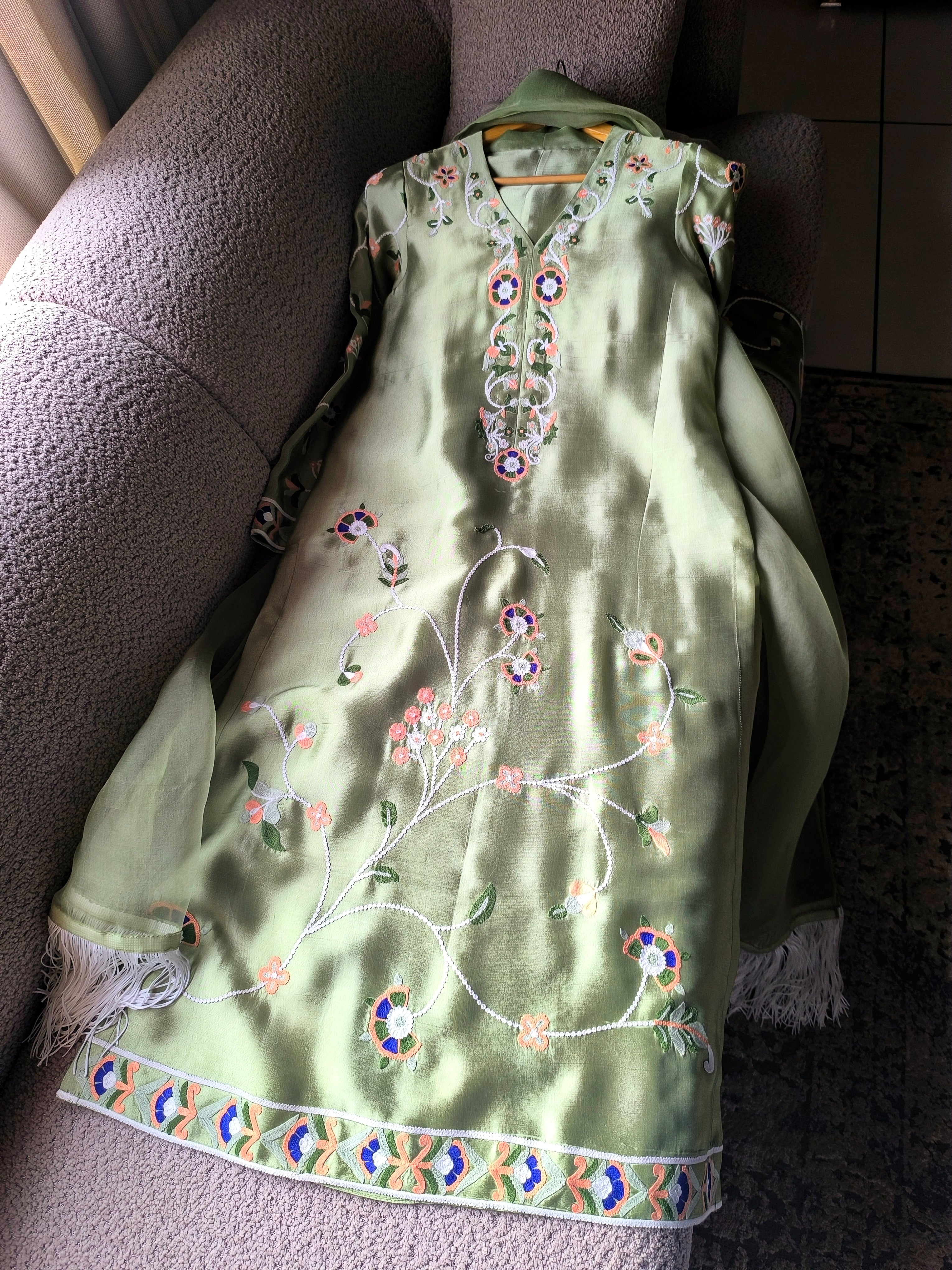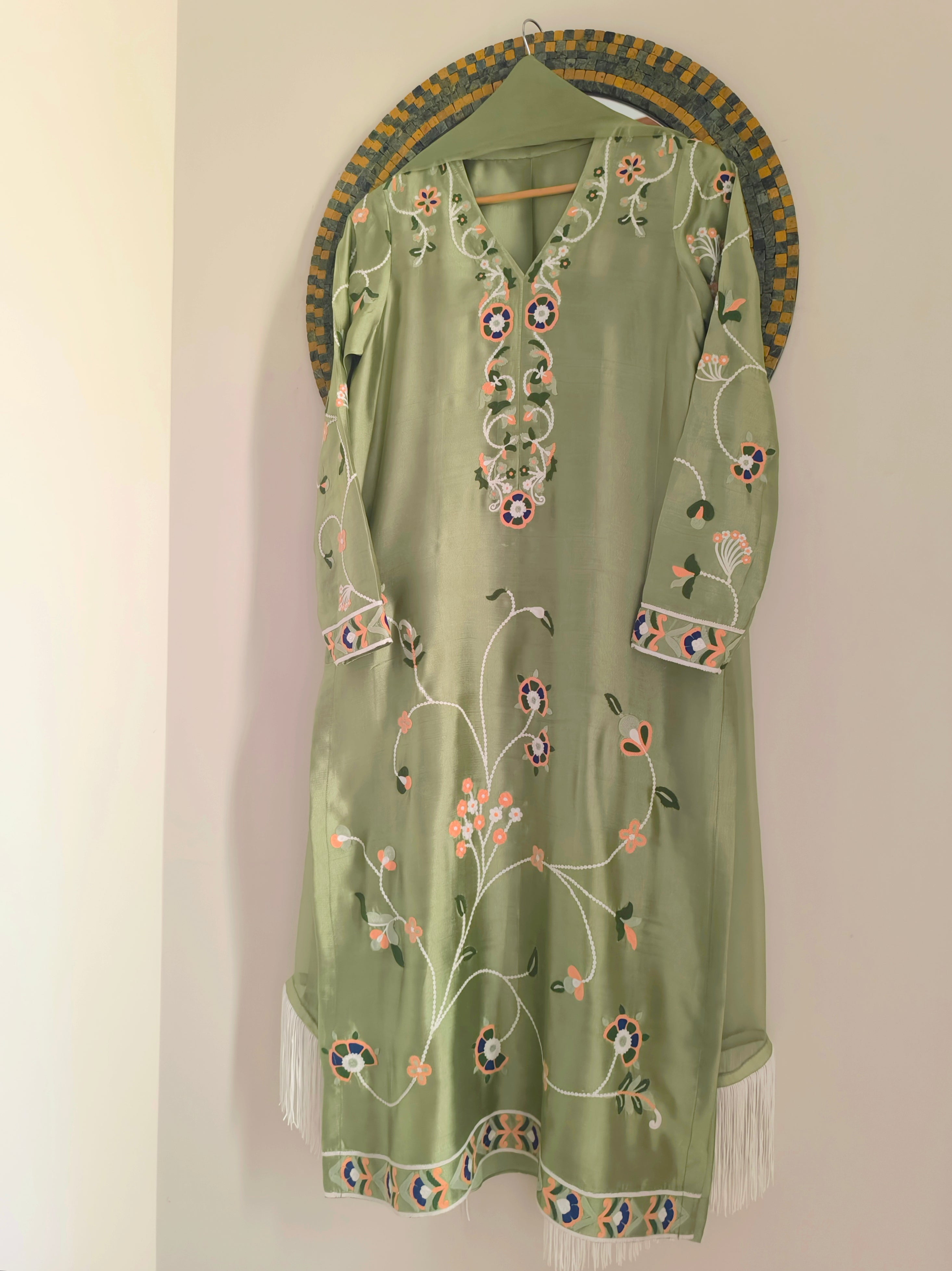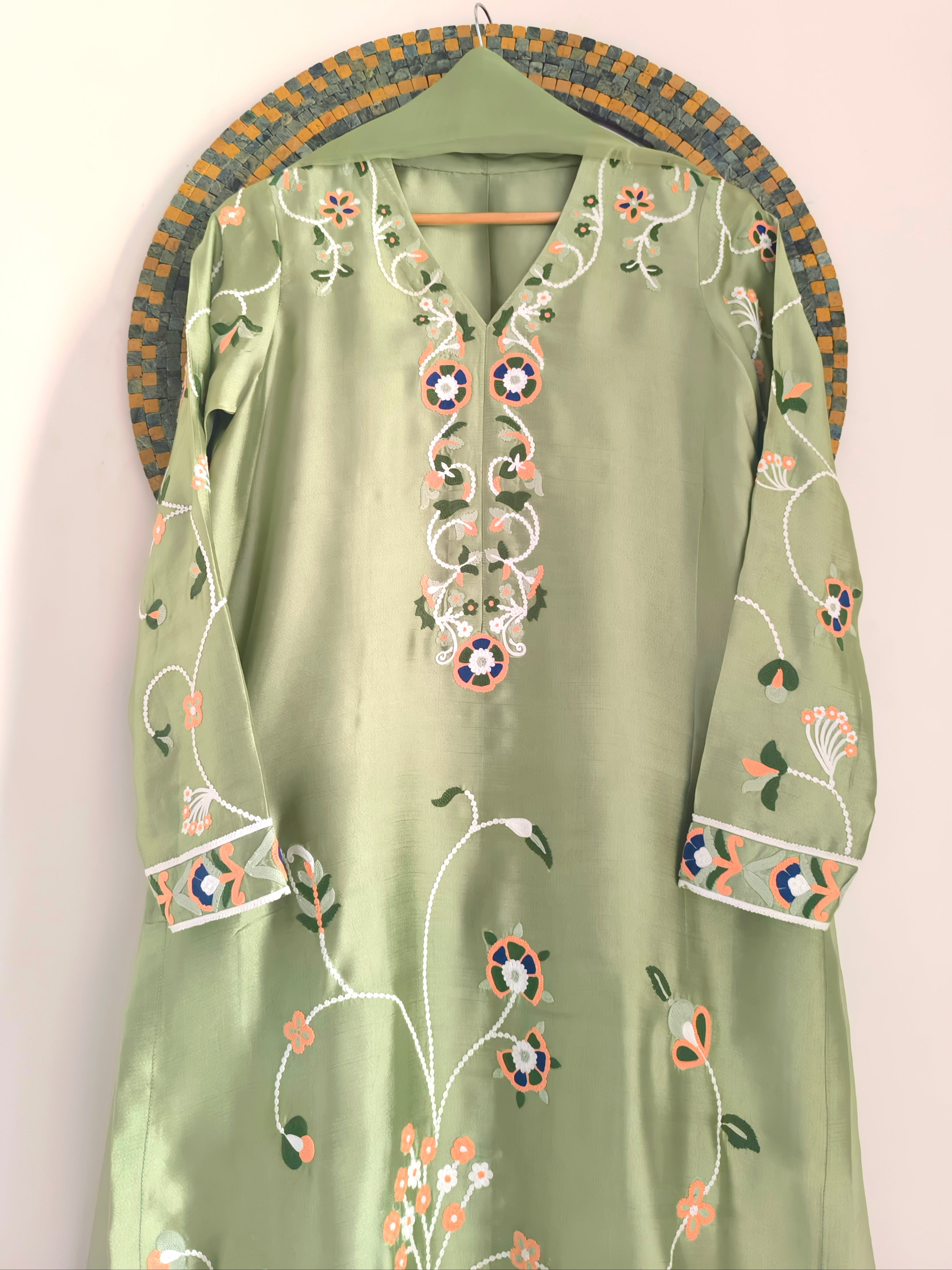 Myra is a statement two-piece set in a soft mint green hue, adorned with ari embroidery in peach, blue, white and shades of green. Complete the look with out organza dupatta featuring a fringe for a delightful touch of playfulness.