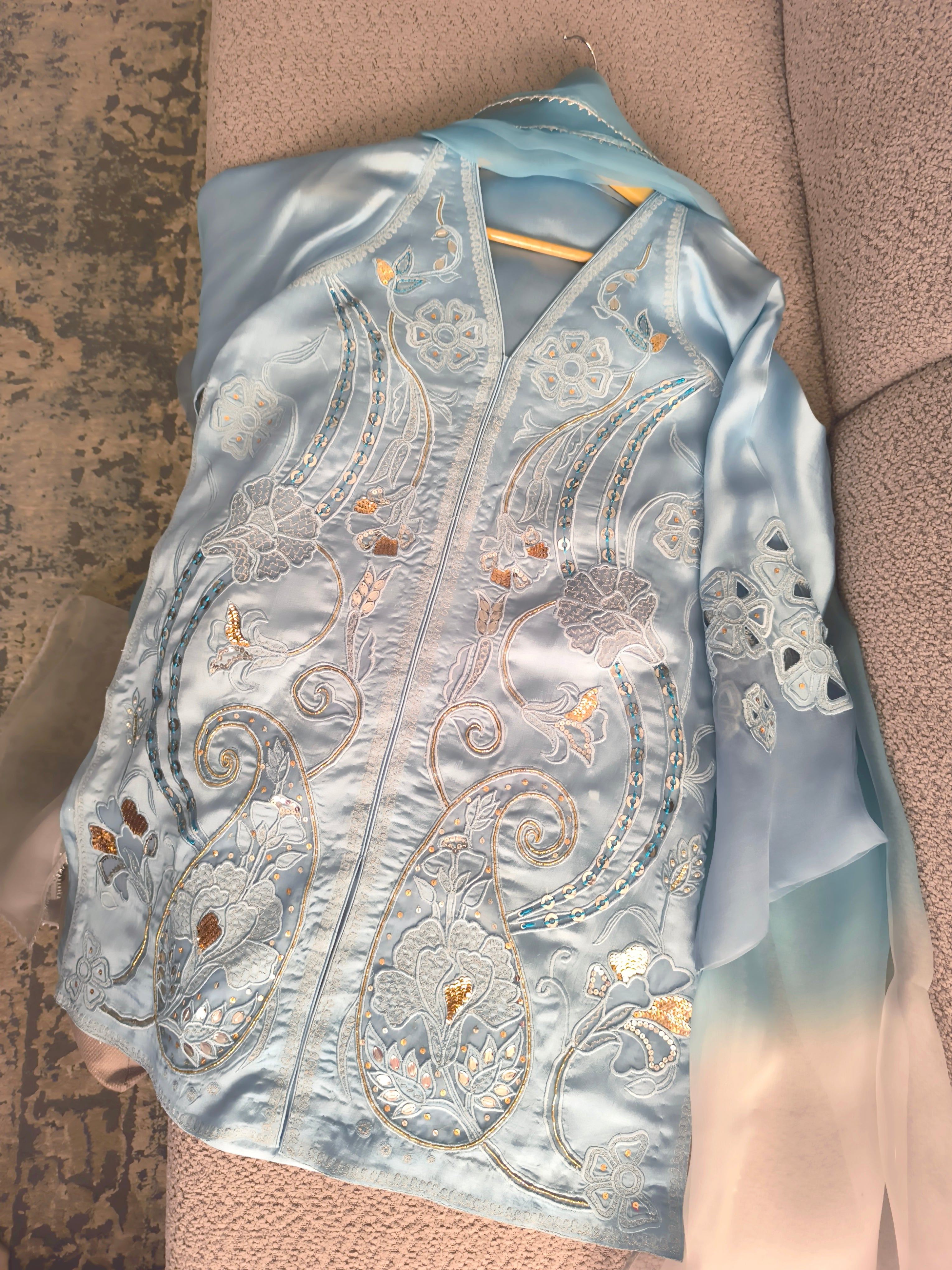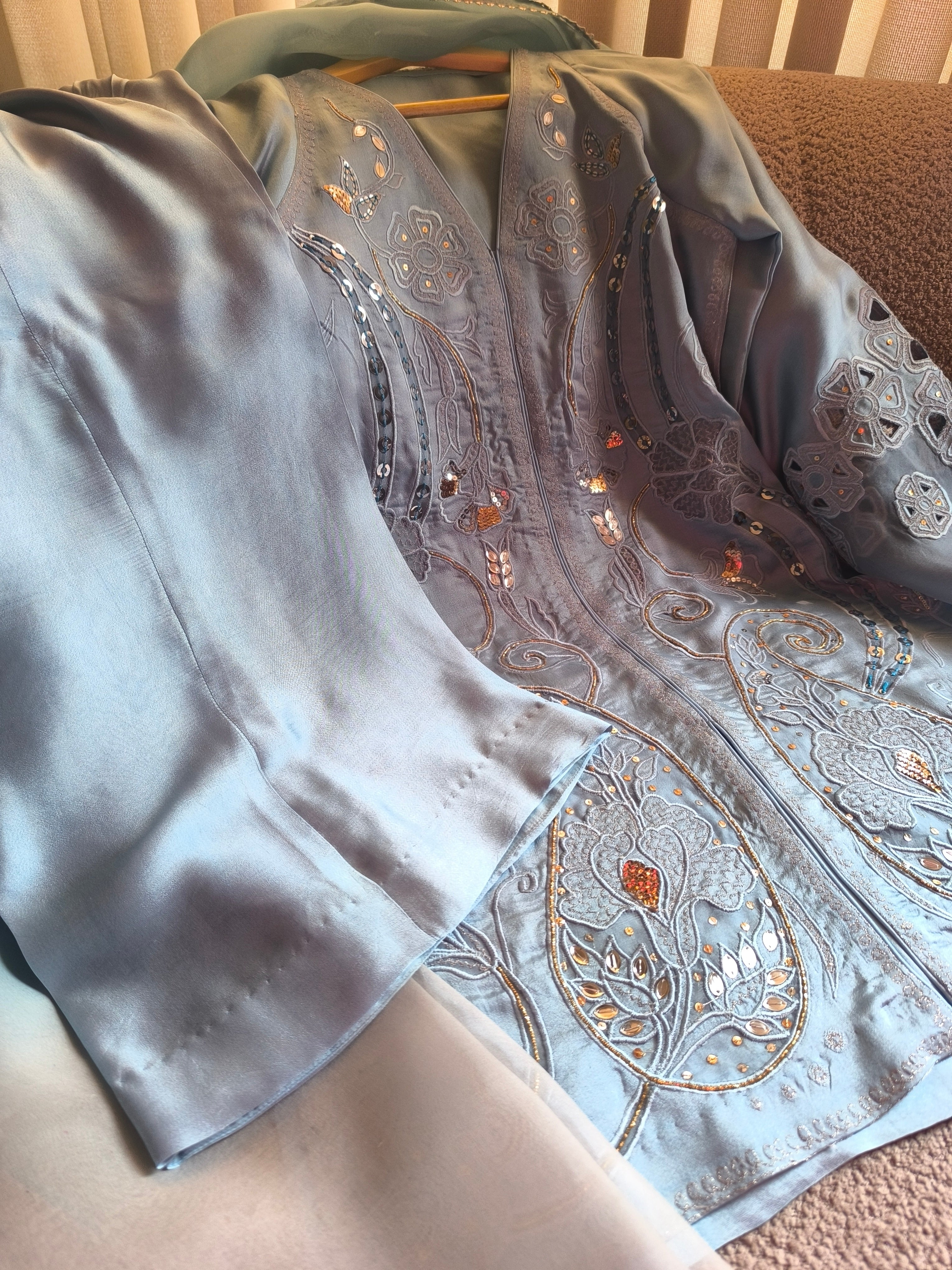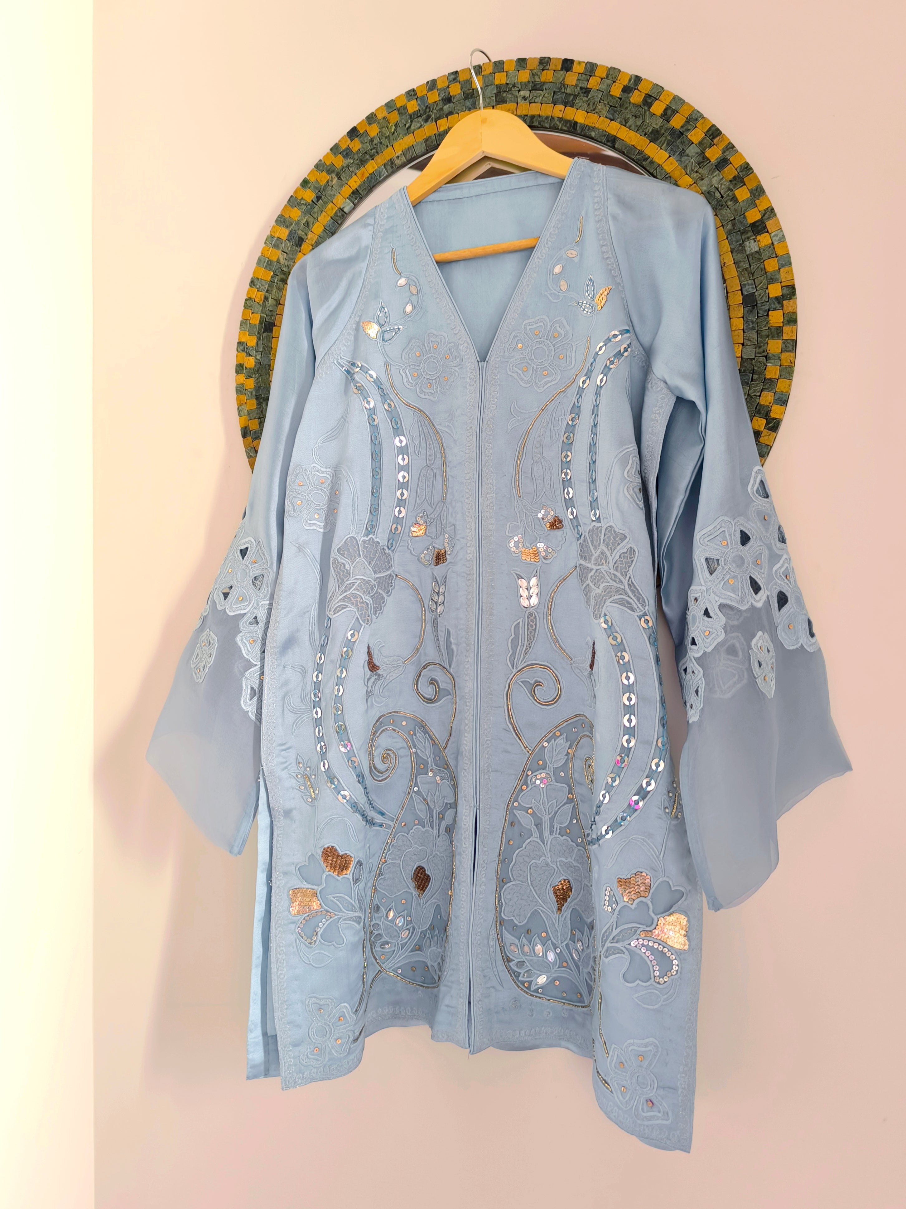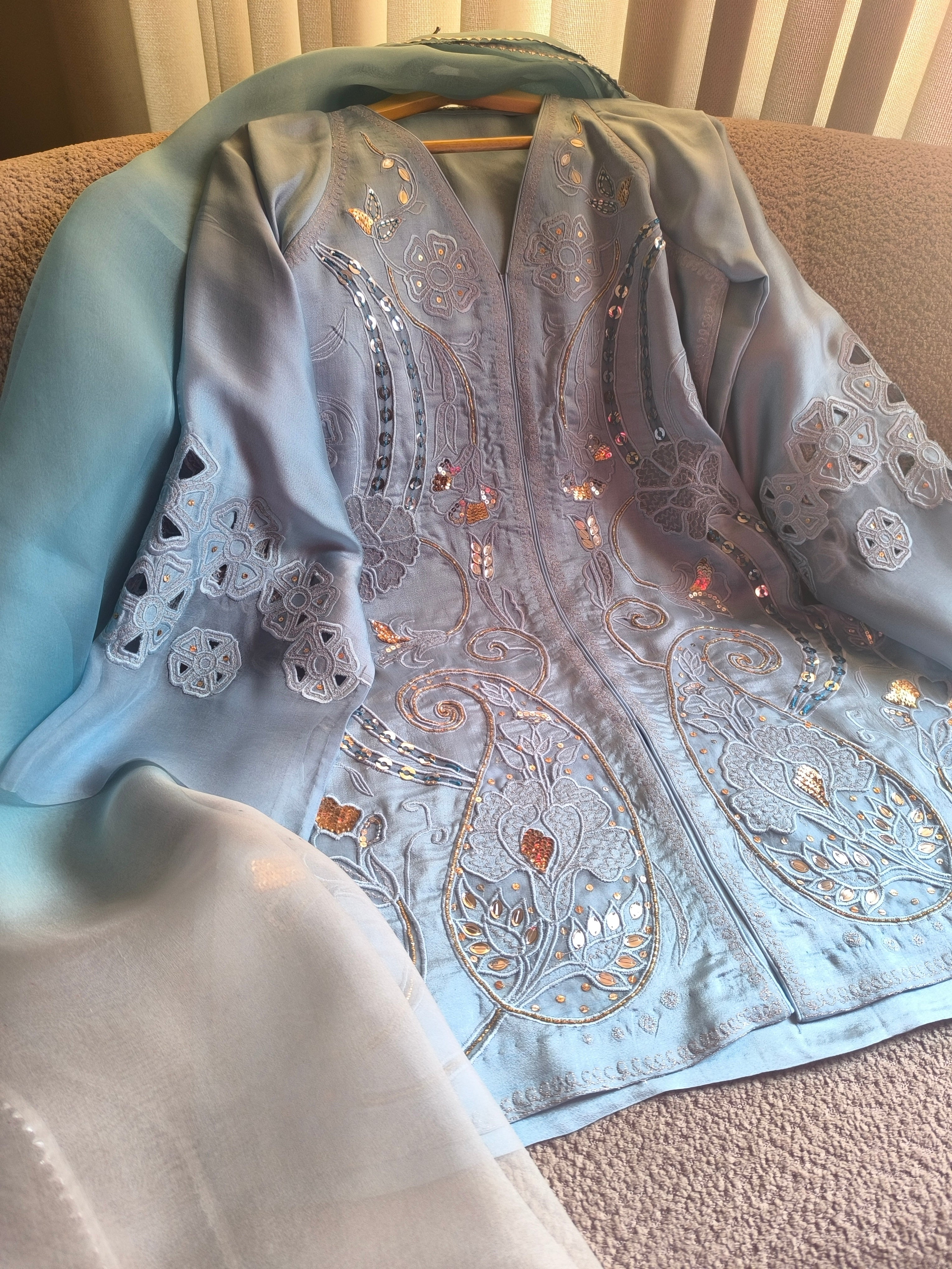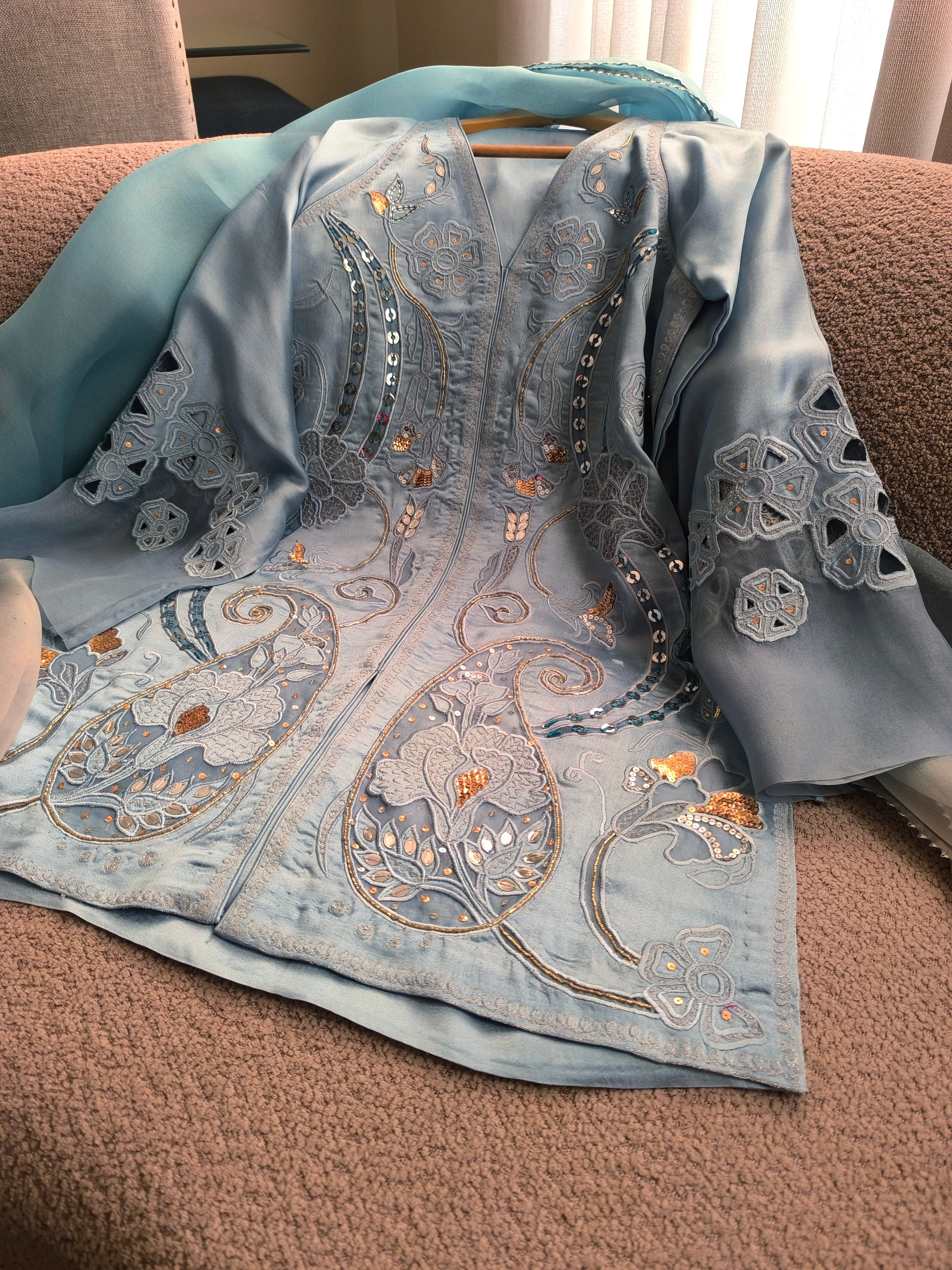 Ariana is a blue silk ensemble featuring a medium-length, jacket-style shirt paired with flared bottoms. Adorned with intricate embroidery, sequins, and delicate naqshi work, it’s a versatile creation that brings a touch of fun and effortless glamour to every occasion.